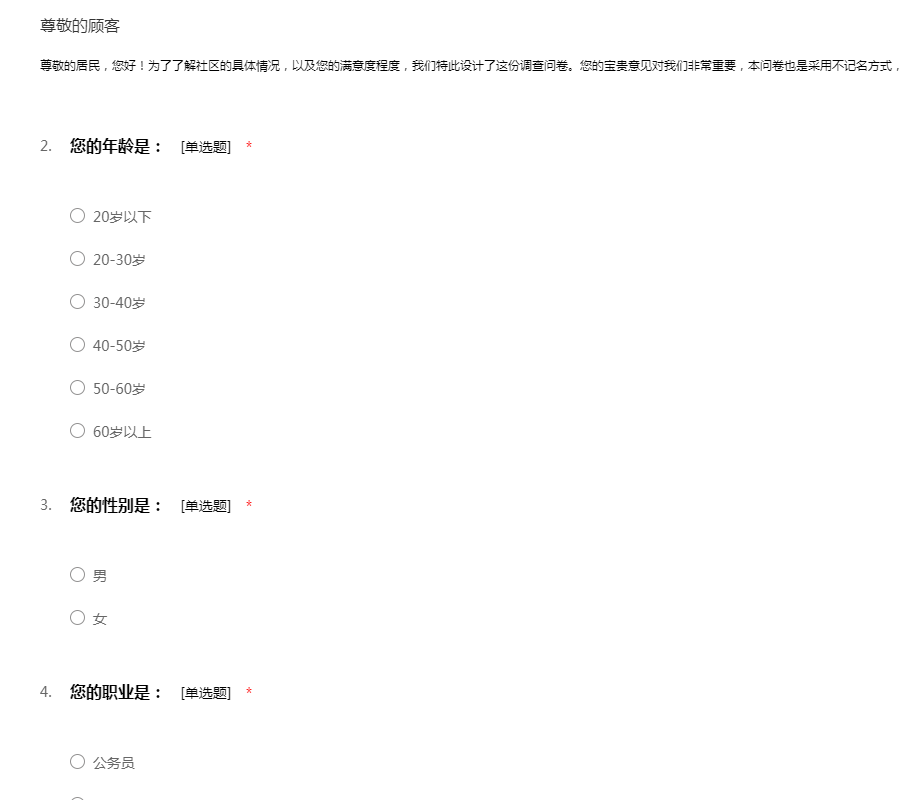 尊敬的居民,您好!为了了解社区的具体情况,以及您的满意度程度,我们特此设计了这份调查问卷。您的宝贵意见对我们非常重要,本问卷也是采用不记名方式,所以请您放心填写。感谢您的支持!