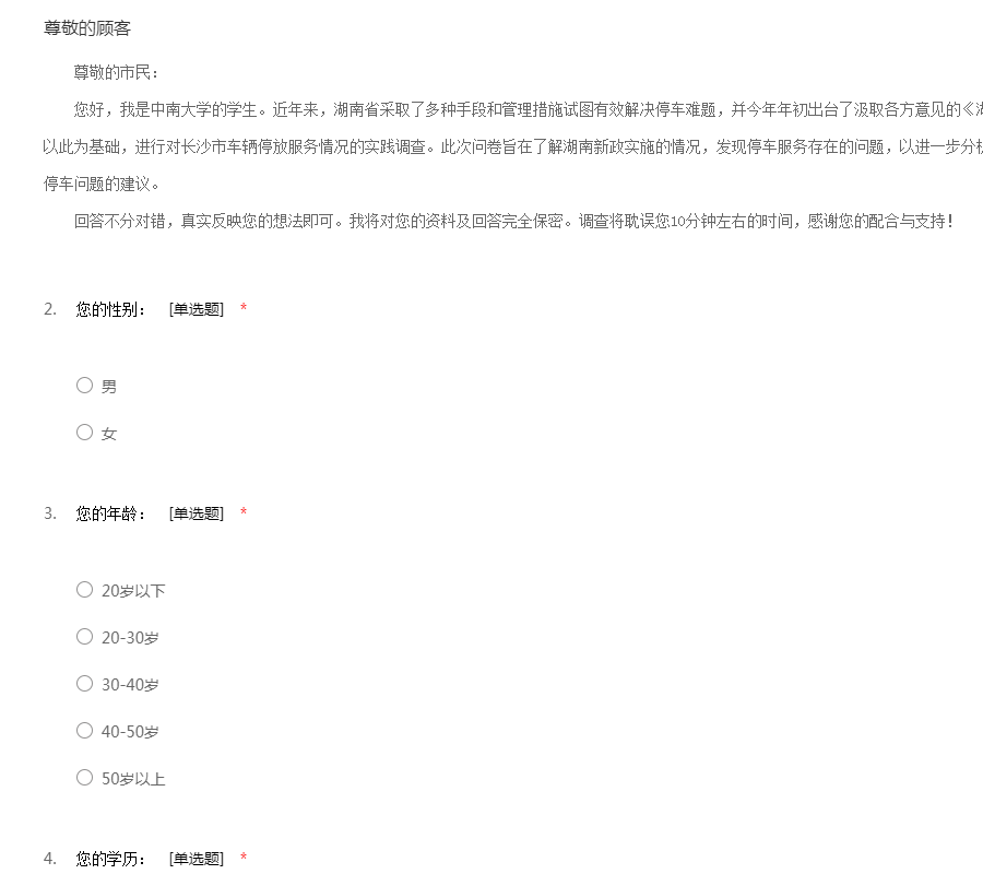 您好,我是中南大学的学生。近年来,湖南省采取了多种手段和管理措施试图有效解决停车难题,并今年年初出台了汲取各方意见的《湖南省机动车停放服务收费管理办法》。以此为基础,进行对长沙市车辆停放服务情况的实践调查。此次问卷旨在了解湖南新政实施的情况,发现停车服务存在的问题,以进一步分析相关政策的实际价值,并得到改善城市停车问题的建议。