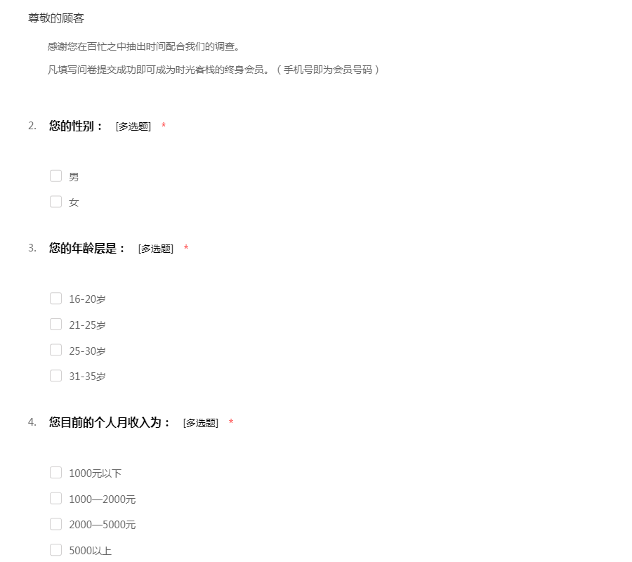 感谢您在百忙之中抽出时间配合我们的调查。 凡填写问卷提交成功即可成为时光客栈的终身会员。(手机号即为会员号码)