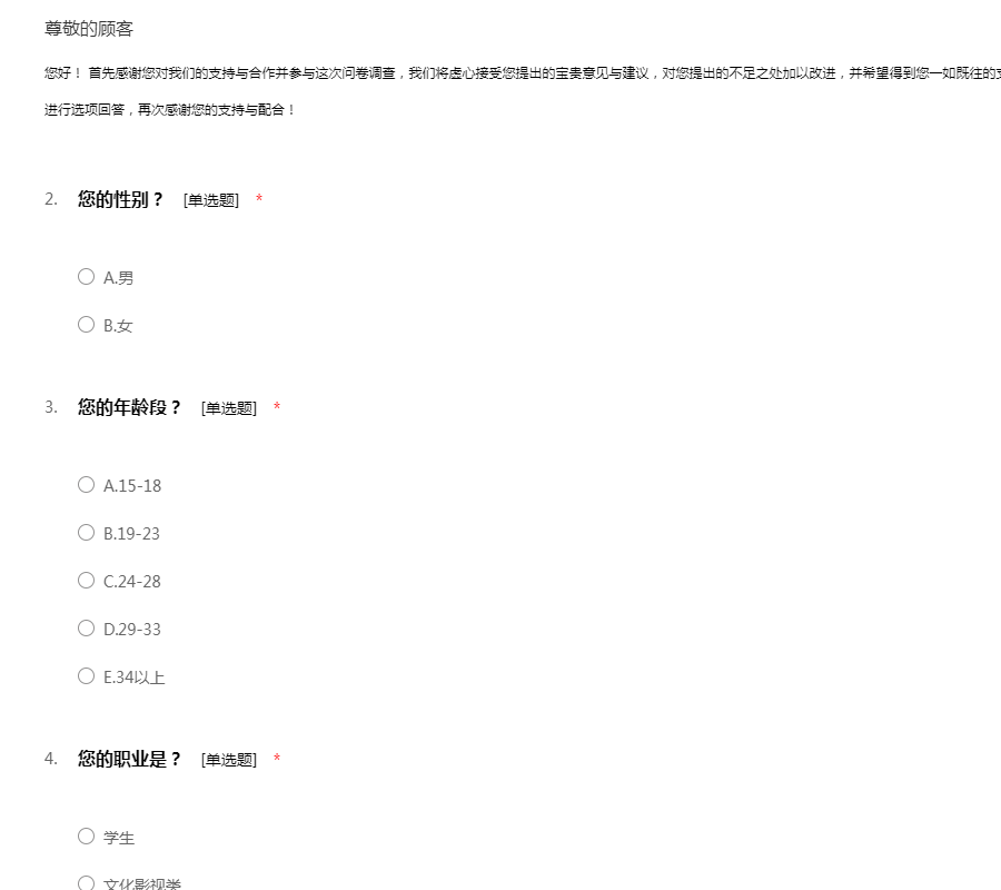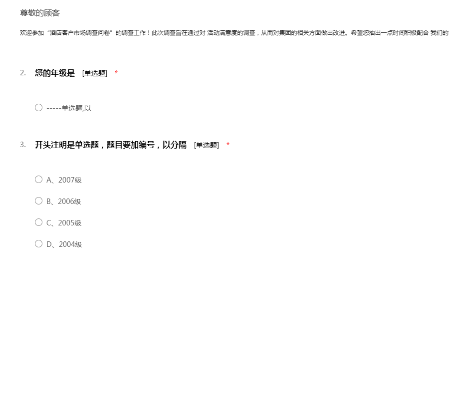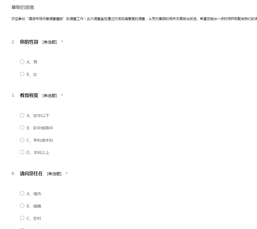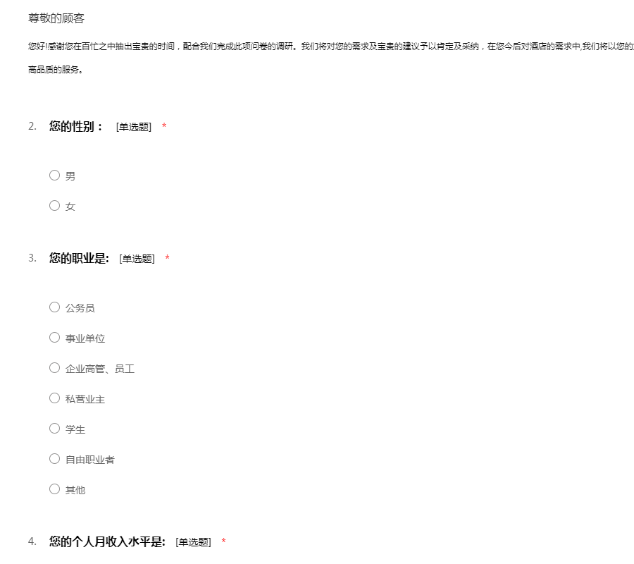 您好!感谢您在百忙之中抽出宝贵的时间,配合我们完成此项问卷的调研。我们将对您的需求及宝贵的建议予以肯定及采纳,在您今后对酒店的需求中,我们将以您的意愿为宗旨,给您创造极为舒适的入住环境以及高品质的服务。