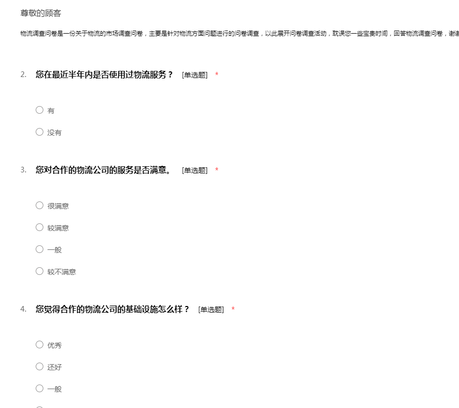 物流调查问卷是一份关于物流的市场调查问卷,主要是针对物流方面问题进行的问卷调查,以此展开问卷调查活动,耽误您一些宝贵时间,回答物流调查问卷,谢谢您的合作。