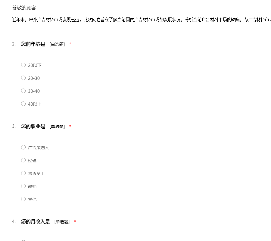 近年来,户外广告材料市场发展迅速,此次问卷旨在了解当前国内广告材料市场的发展状况,分析当前广告材料市场的缺陷,为广告材料市场提供更好的发展前景。