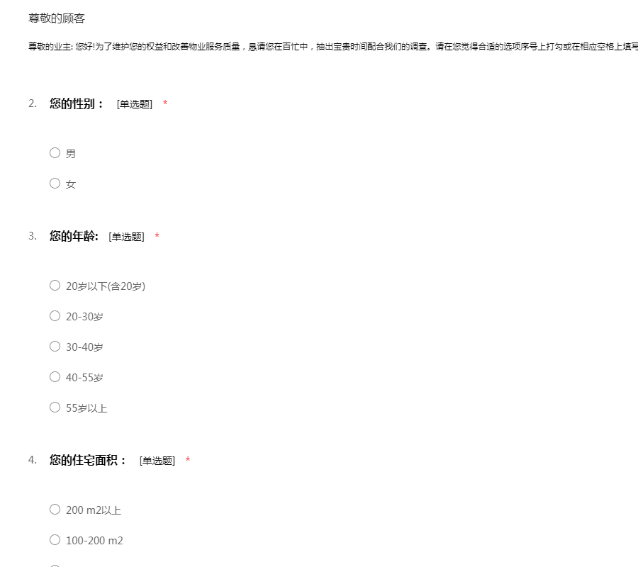 尊敬的业主: 您好!为了维护您的权益和改善物业服务质量,恳请您在百忙中,抽出宝贵时间配合我们的调查。请在您觉得合适的选项序号上打勾或在相应空格上填写。非常感谢您的大力支持!