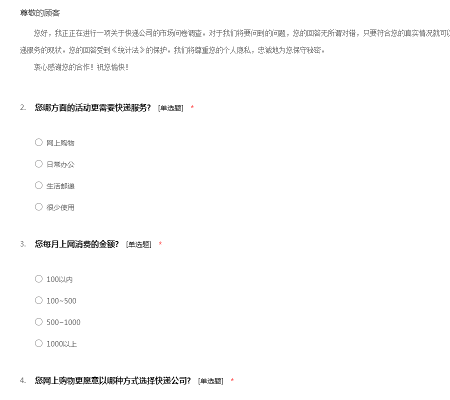 您好,我正正在进行一项关于快递公司的市场问卷调查。对于我们将要问到的问题,您的回答无所谓对错,只要符合您的真实情况就可以了。您的回答与合作,将有利于改善快递服务的现状。您的回答受到《统计法》的保护。我们将尊重您的个人隐私,忠诚地为您保守秘密。 衷心感谢您的合作!祝您愉快!