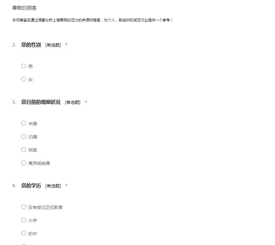 本问卷旨在通过调查分析上海居民的压力的来源和程度,为个人、各组织和减压行业提供一个参考!