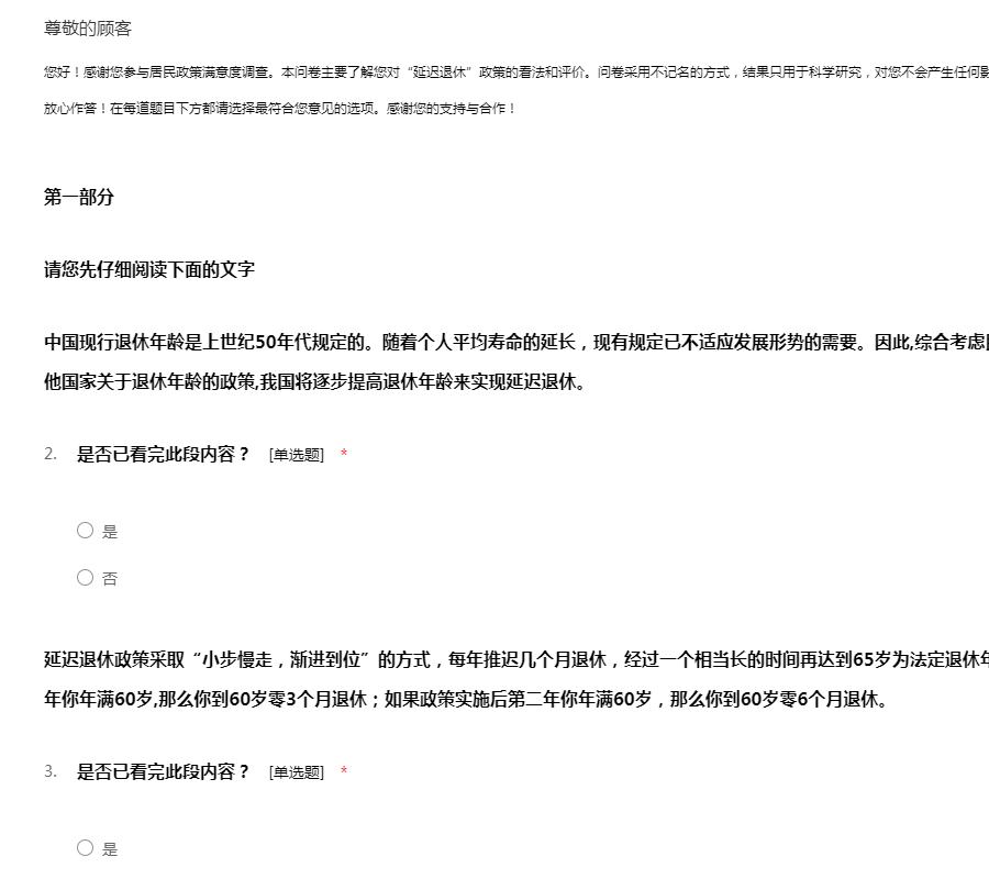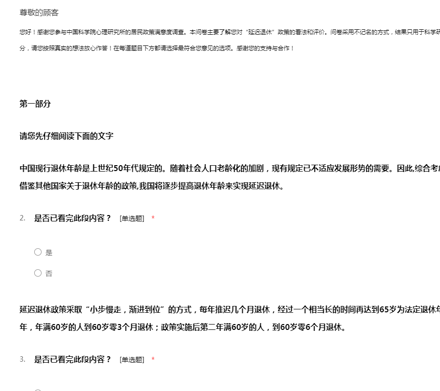您好!感谢您参与中国科学院心理研究所的居民政策满意度调查。本问卷主要了解您对“延迟退休”政策的看法和评价。问卷采用不记名的方式,结果只用于科学研究,对您不会产生任何影响,且答案没有对错之分,请您按照真实的想法放心作答!在每道题目下方都请选择最符合您意见的选项。感谢您的支持与合作!