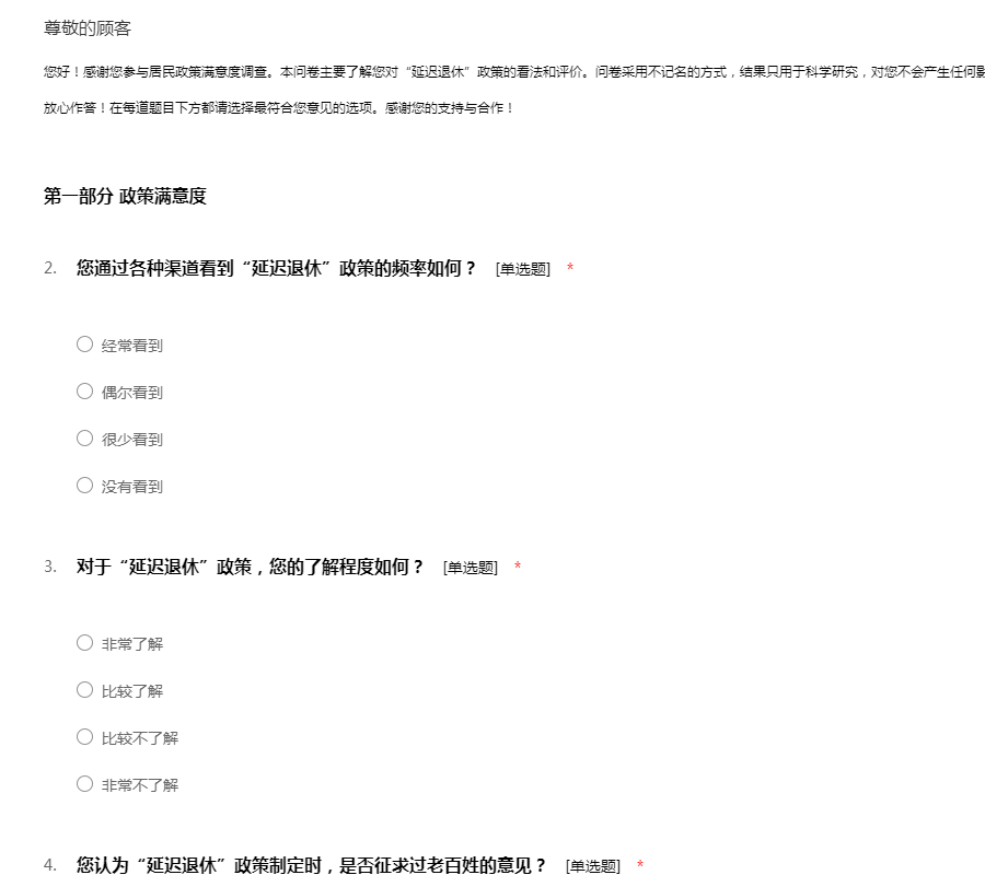 您好!感谢您参与居民政策满意度调查。本问卷主要了解您对“延迟退休”政策的看法和评价。问卷采用不记名的方式,结果只用于科学研究,对您不会产生任何影响,且答案没有对错之分,请您按照真实的想法放心作答!在每道题目下方都请选择最符合您意见的选项。感谢您的支持与合作!