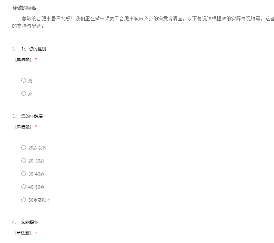 尊敬的合肥市居民您好!我们正在做一项关于合肥市城市公交的满意度调查,以下情况请根据您的实际情况填写,这些问卷内容都是匿名保密的,感谢您的支持与配合。