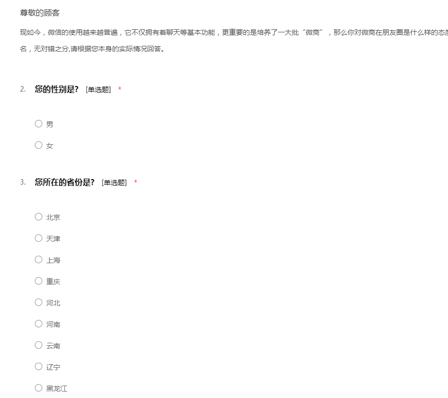 现如今,微信的使用越来越普遍,它不仅拥有着聊天等基本功能,更重要的是培养了一大批“微商”,那么你对微商在朋友圈是什么样的态度呢?欢迎参与此次调查,本问卷不记名,无对错之分,请根据您本身的实际情况回答。