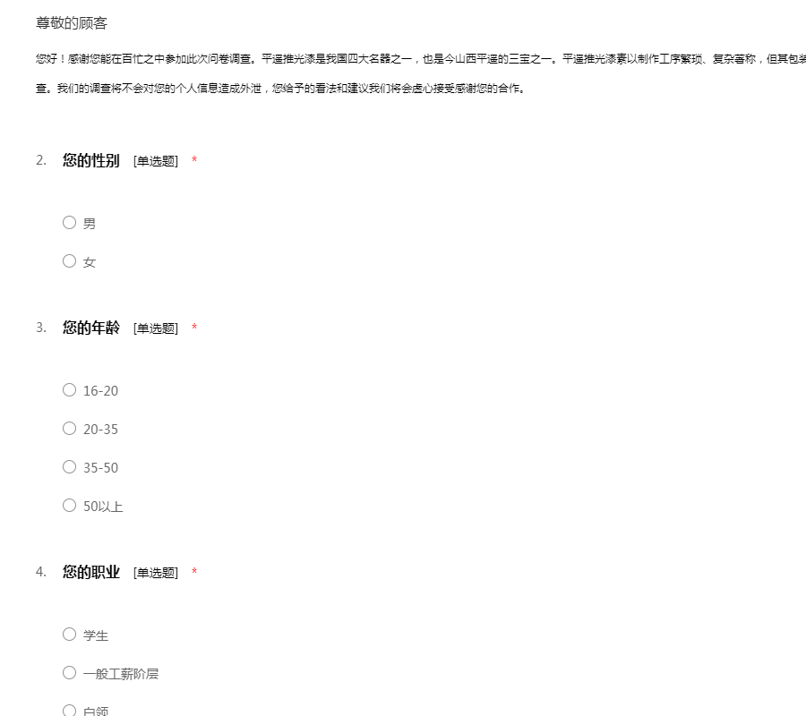 您好!感谢您能在百忙之中参加此次问卷调查。平遥推光漆是我国四大名器之一,也是今山西平遥的三宝之一。平遥推光漆素以制作工序繁琐、复杂著称,但其包装不统一、简陋无创意、无产品信息,特做此次调查。我们的调查将不会对您的个人信息造成外泄,您给予的看法和建议我们将会虚心接受感谢您的合作。
