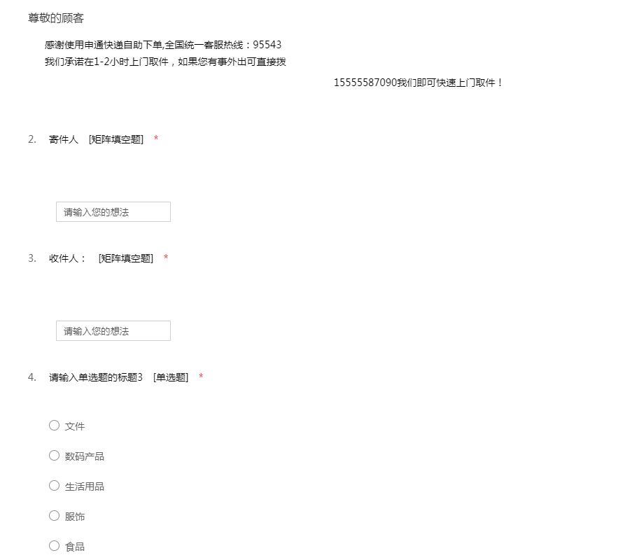 感谢使用申通快递自助下单,全国统一客服热线:95543 我们承诺在1-2小时上门取件,如果您有事外出可直接拨 15555587090我们即可快速上门取件!
