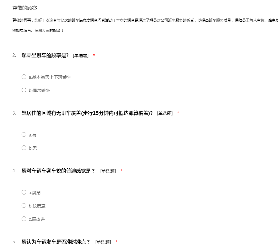 尊敬的同事,您好!欢迎参与此次的班车满意度调查问卷活动!本次的调查是通过了解员对公司班车服务的感受,以提高班车服务质量,保障员工每人有位、准点发车、按时到达。 此次问卷不记名,希望大家能够如实填写。感谢大家的配合!