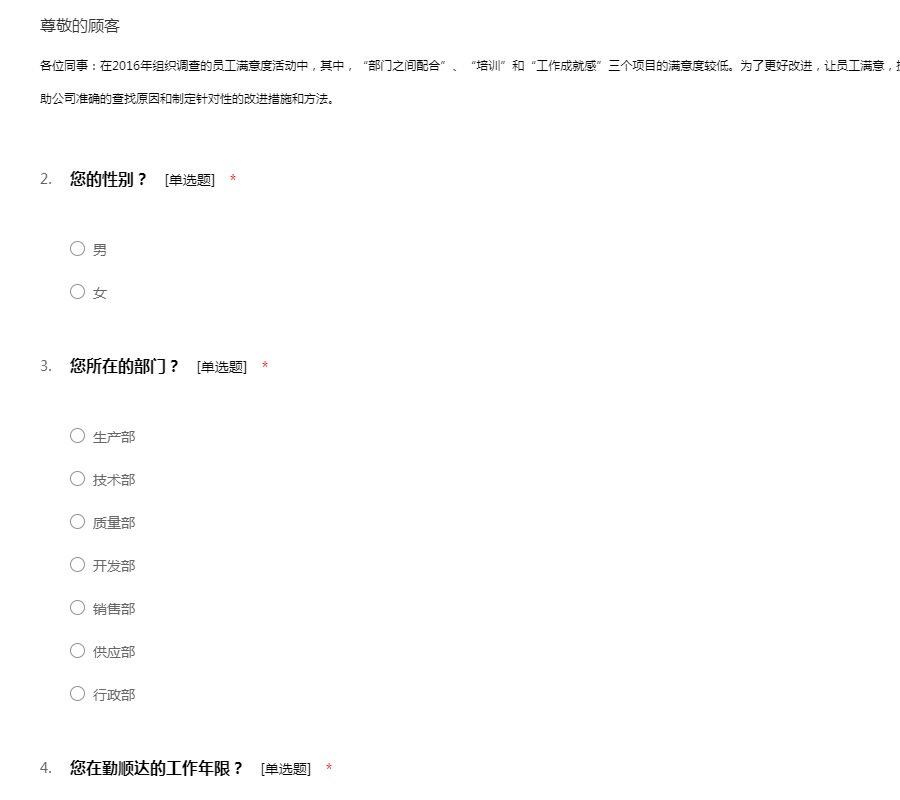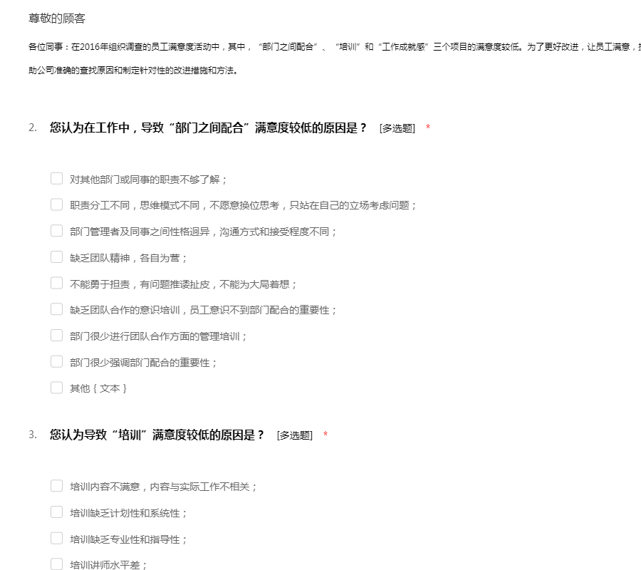 各位同事:在2016年组织调查的员工满意度活动中,其中,“部门之间配合”、“培训”和“工作成就感”三个项目的满意度较低。为了更好改进,让员工满意,提高员工的满意度,特进行本次专项调查,以帮助公司准确的查找原因和制定针对性的改进措施和方法。