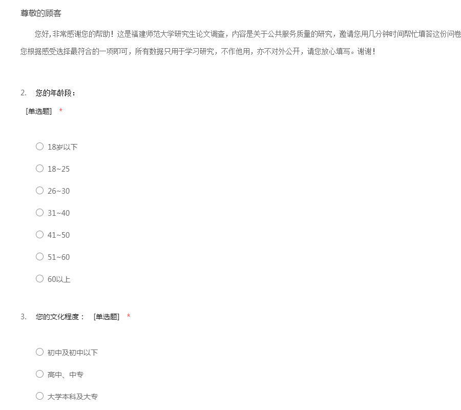 您好,非常感谢您的帮助!这是福建师范大学研究生论文调查,内容是关于公共服务质量的研究,邀请您用几分钟时间帮忙填答这份问卷。问卷采用匿名填写,选项无对错之分,请您根据感受选择最符合的一项即可,所有数据只用于学习研究,不作他用,亦不对外公开,请您放心填写。谢谢!