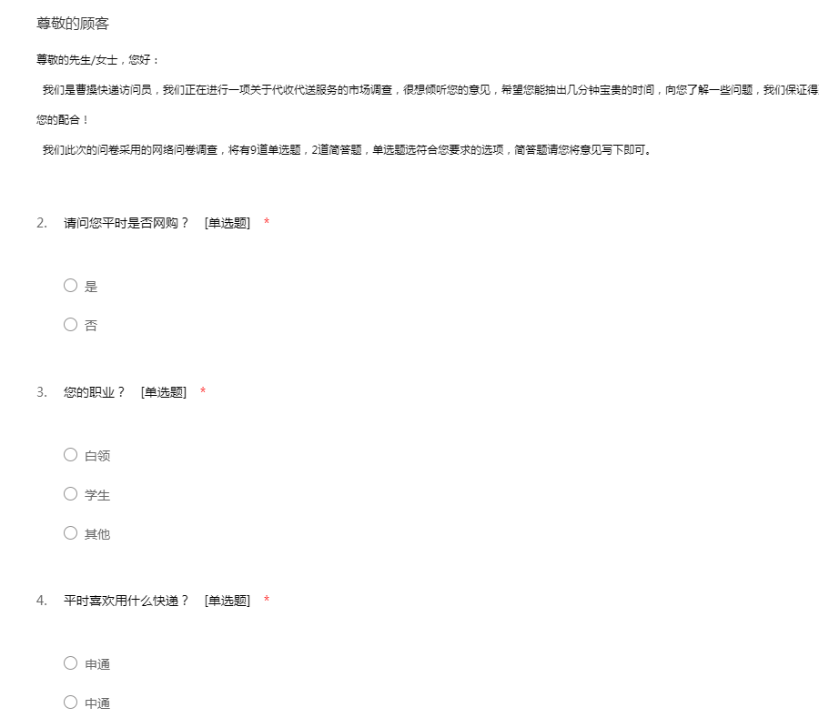 尊敬的先生/女士,您好: 我们是曹操快递访问员,我们正在进行一项关于代收代送服务的市场调查,很想倾听您的意见,希望您能抽出几分钟宝贵的时间,向您了解一些问题,我们保证得到的信息将全部用于调研之用,并且保密。谢谢您的配合! 我们此次的问卷采用的网络问卷调查,将有9道单选题,2道简答题,单选题选符合您要求的选项,简答题请您将意见写下即可。