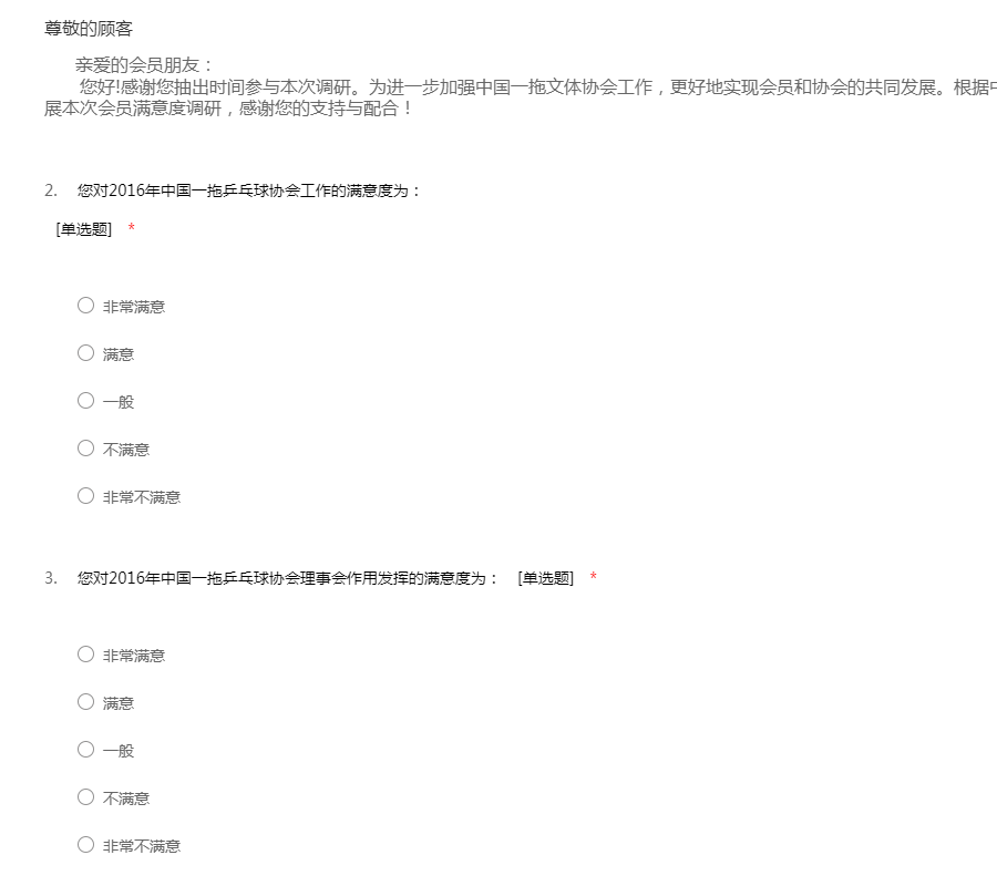 2016年中国一拖乒乓球协会满意度调研