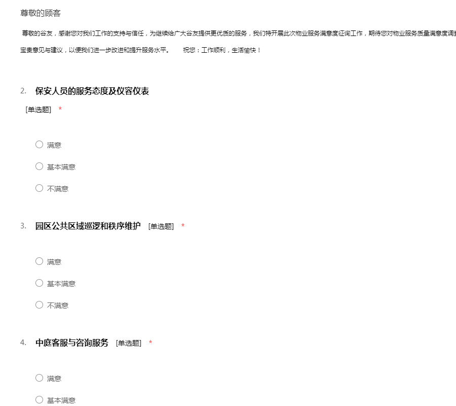 尊敬的谷友,感谢您对我们工作的支持与信任,为继续给广大谷友提供更优质的服务,我们特开展此次物业服务满意度征询工作,期待您对物业服务质量满意度调查予以真实的评价,并提出您对物业服务工作的宝贵意见与建议,以便我们进一步改进和提升服务水平。 祝您:工作顺利,生活愉快!