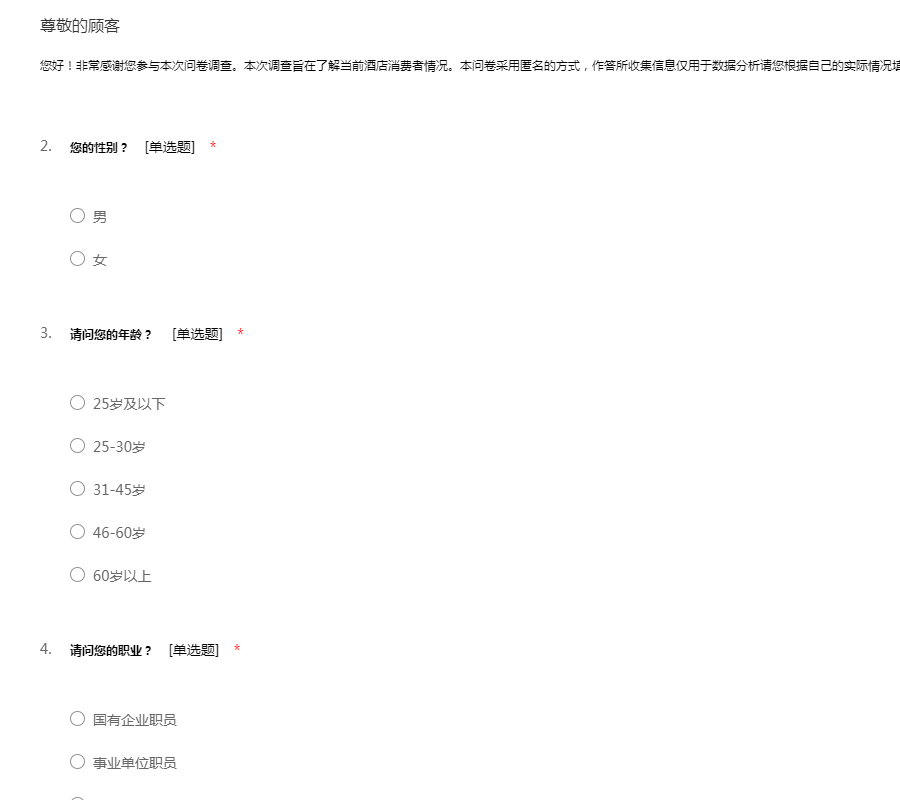 您好!非常感谢您参与本次问卷调查。本次调查旨在了解当前酒店消费者情况。本问卷采用匿名的方式,作答所收集信息仅用于数据分析请您根据自己的实际情况填写。