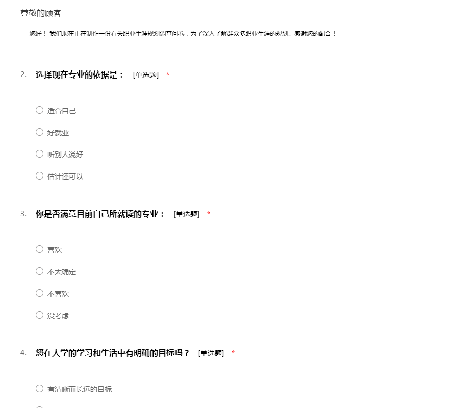 您好! 我们现在正在制作一份有关职业生涯规划调查问卷,为了深入了解群众多职业生涯的规划。感谢您的配合!