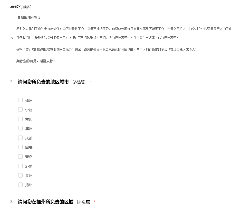 尊敬的地产领导: 感谢您对我们工作的支持与信任。为不断改进工作,提供更好的服务,伯恩总公司特开展此次满意度调查工作,恳请您百忙之中抽空对物业和酒管负责人的工作效果进行真实评价,并给予您的宝贵意见与建议,以便我们进一步改进和提升服务水平。(请在下列各项测评内容相对应的评议意见栏内以“¤”方式填上你的评议意见) 保密承诺:您的所有回答51调查网会无条件保密,最终的数据呈现会已满意度分值提醒,单个人的评价绝对不会提交给委托人或个人! 期待您的回复,感谢支持!