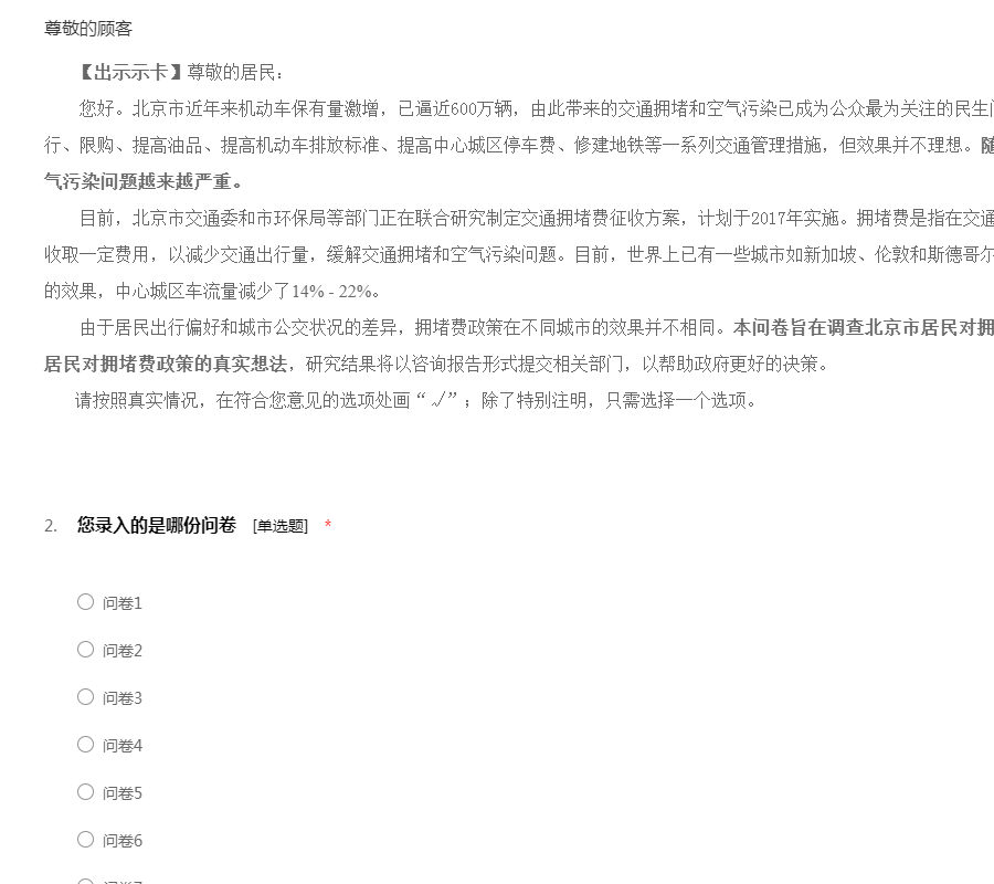 由于居民出行偏好和城市公交状况的差异,拥堵费政策在不同城市的效果并不相同。本问卷旨在调查北京市居民对拥堵费政策的态度与行为反应,了解居民对拥堵费政策的真实想法,研究结果将以咨询报告形式提交相关部门,以帮助政府更好的决策。