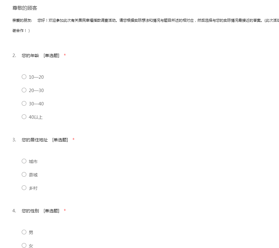 亲爱的朋友: 您好!欢迎参加此次有关居民幸福指数调查活动。请您根据实际想法和情况与题目所述的相对应,然后选择与您的实际情况最接近的答案。(此次活动以不记名开展,您的回答不会进入任何档案,谢谢合作!)