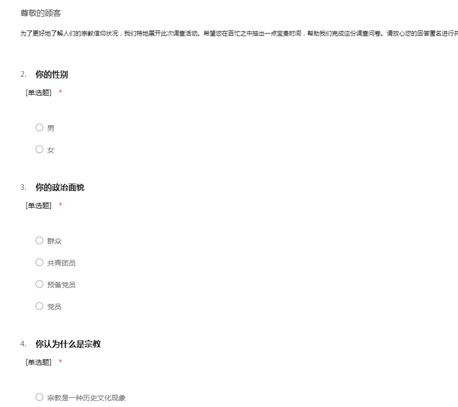 为了更好地了解人们的宗教信仰状况,我们特地展开此次调查活动。希望您在百忙之中抽出一点宝贵时间,帮助我们完成这份调查问卷。请放心您的回答匿名进行并将完全保密,谢谢!