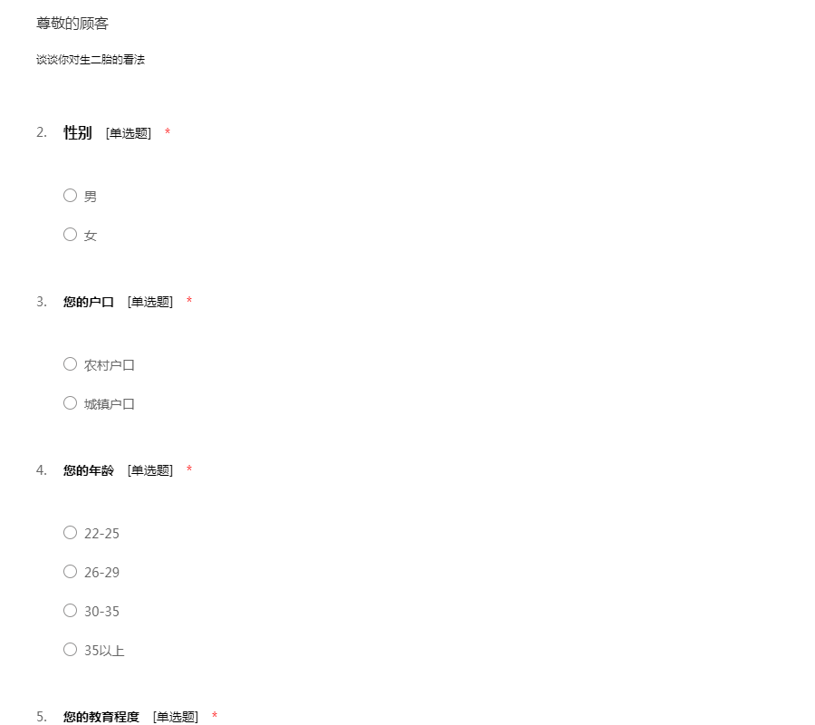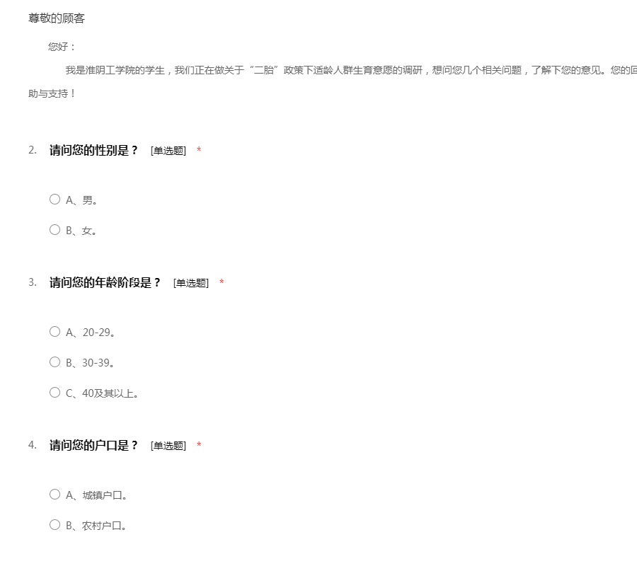您好: 我是淮阴工学院的学生,我们正在做关于“二胎”政策下适龄人群生育意愿的调研,想问您几个相关问题,了解下您的意见。您的回答将被完全保密,请您放心。谢谢你的协助与支持!