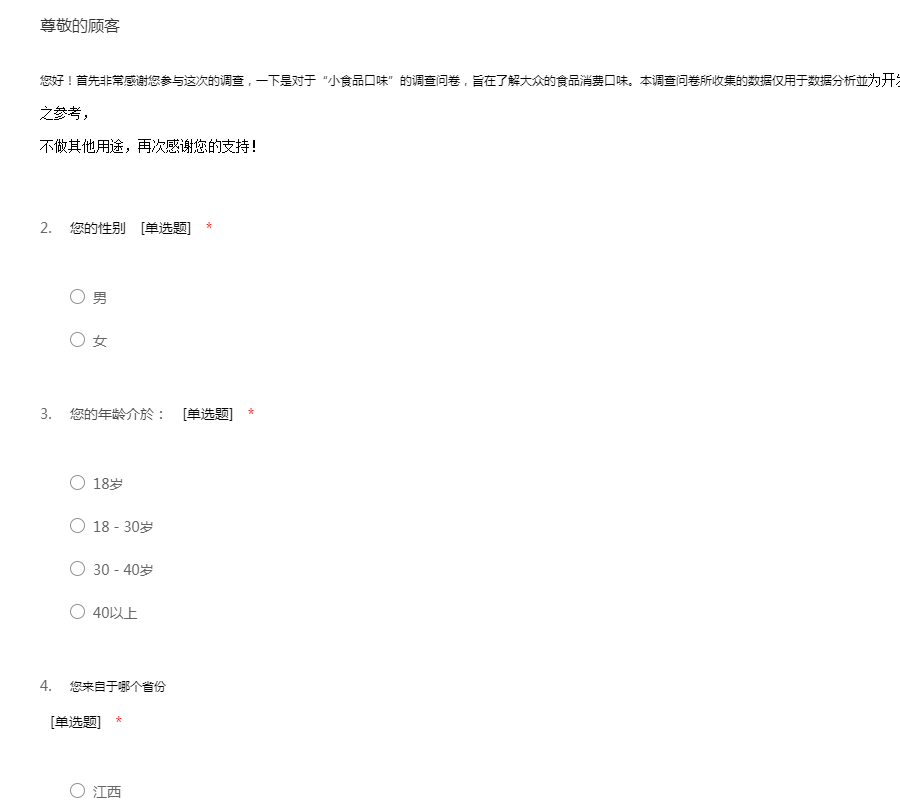 您好!首先非常感谢您参与这次的调查,一下是对于“小食品口味”的调查问卷,旨在了解大众的食品消费口味。本调查问卷所收集的数据仅用于数据分析並为开发新品之参考,不做其他用途,再次感谢您的支持!