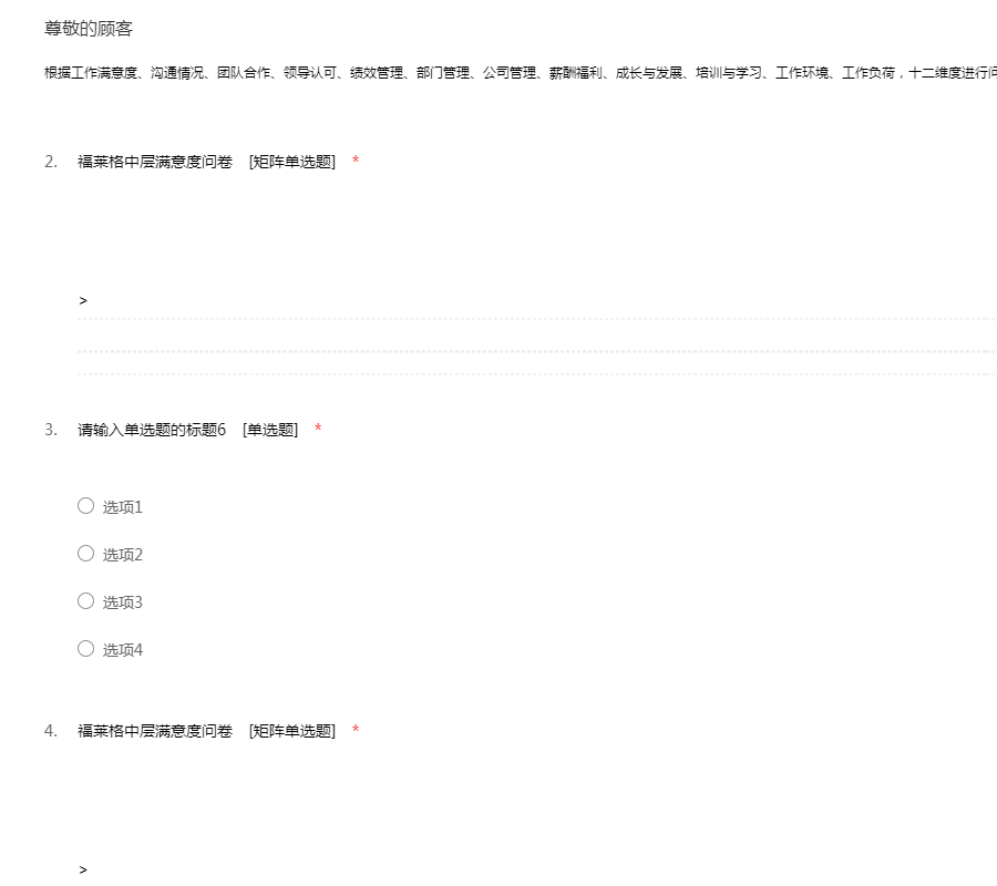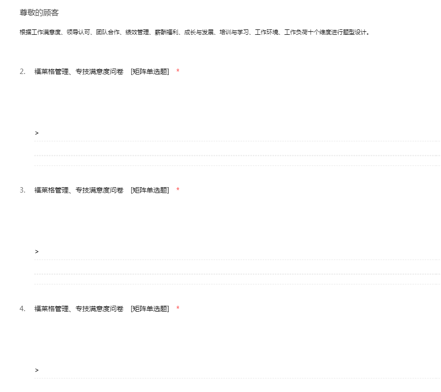 根据工作满意度、沟通情况、团队合作、领导认可、绩效管理、部门管理、公司管理、薪酬福利、成长与发展、培训与学习、工作环境、工作负荷,十二维度进行问卷设计