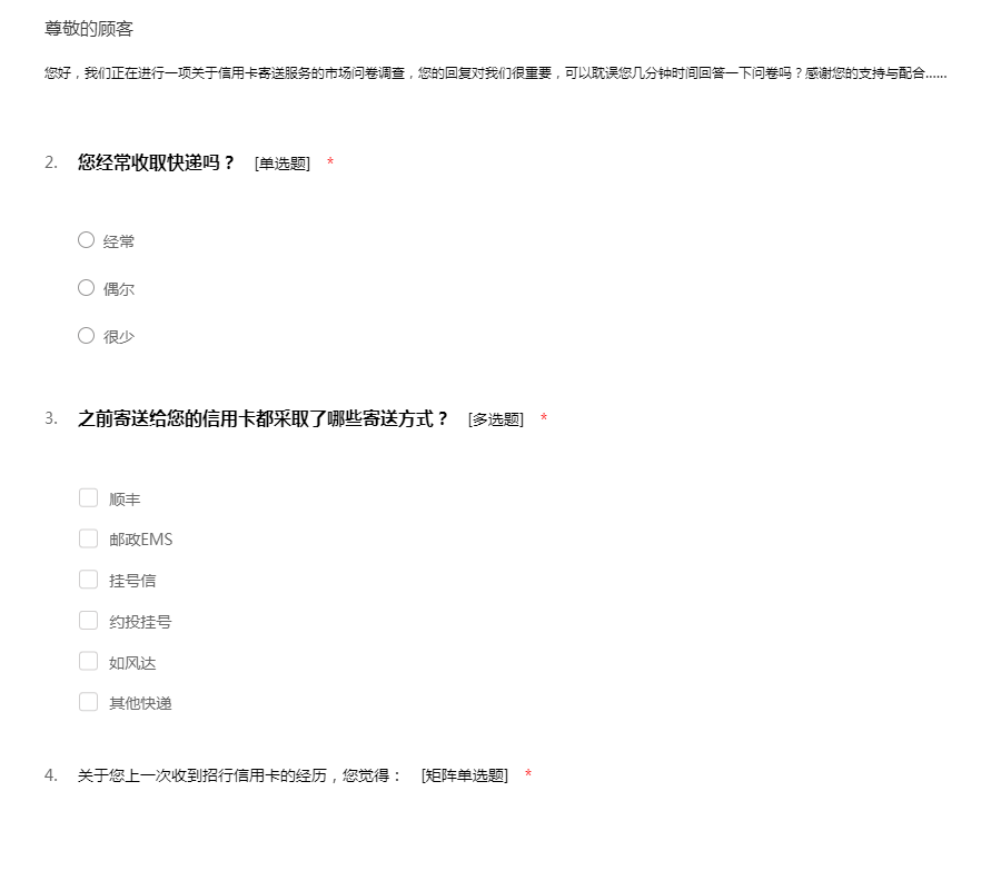 您好,我们正在进行一项关于信用卡寄送服务的市场问卷调查,您的回复对我们很重要,可以耽误您几分钟时间回答一下问卷吗?感谢您的支持与配合……