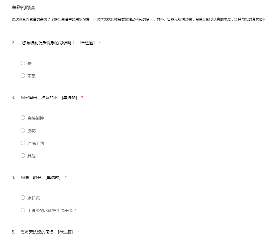 这次调查问卷目的是为了了解您生活中的用水习惯,一次作为我们社会实践活动研究的第一手材料。答案无所谓对错,希望您能以认真的态度,选择与您的真实情况和想法相符合的答案。真的很感谢您的帮忙。