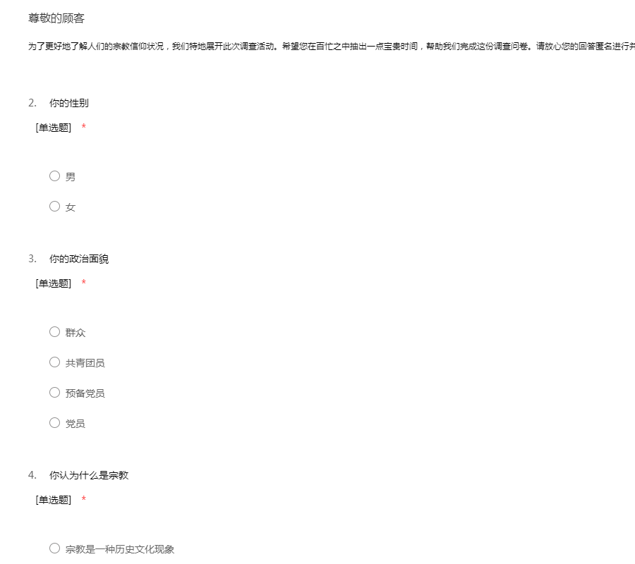 为了更好地了解人们的宗教信仰状况,我们特地展开此次调查活动。希望您在百忙之中抽出一点宝贵时间,帮助我们完成这份调查问卷。请放心您的回答匿名进行并将完全保密,谢谢!