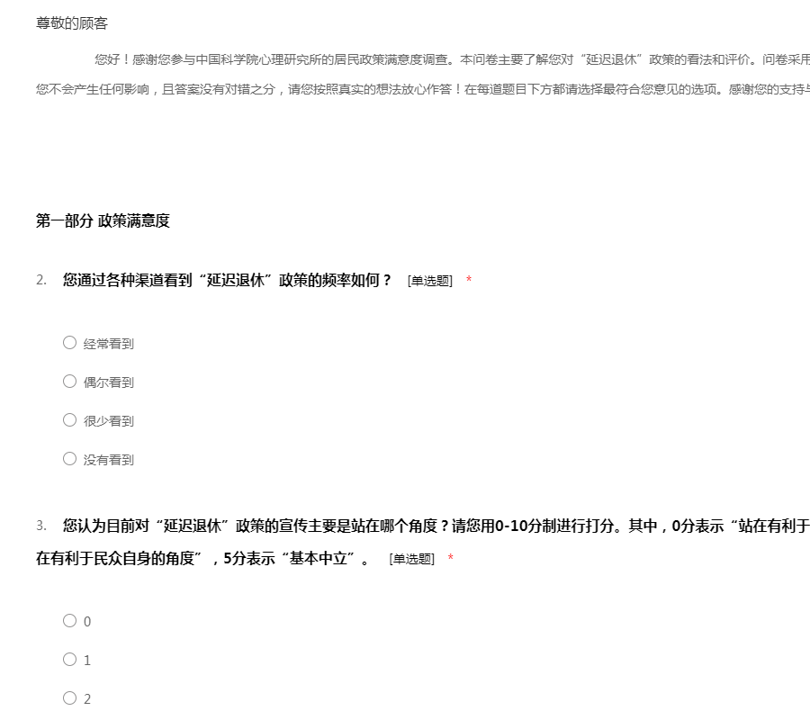 您好!感谢您参与中国科学院心理研究所的居民政策满意度调查。本问卷主要了解您对“延迟退休”政策的看法和评价。问卷采用不记名的方式,结果只用于科学研究,对您不会产生任何影响,且答案没有对错之分,请您按照真实的想法放心作答!在每道题目下方都请选择最符合您意见的选项。感谢您的支持与合作! 中国科学院心理研究所 曾艳 2016年8月