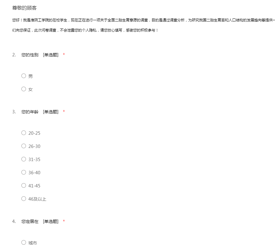 您好!我是淮阴工学院的在校学生,现在正在进行一项关于全面二胎生育意愿的调查,目的是通过调查分析,为研究我国二胎生育率和人口结构的发展趋向等提供一个依据和视角,因此希望您认真填写该问卷,我们向您保证,此次问卷调查,不会泄露您的个人隐私,请您放心填写,感谢您的积极参与!