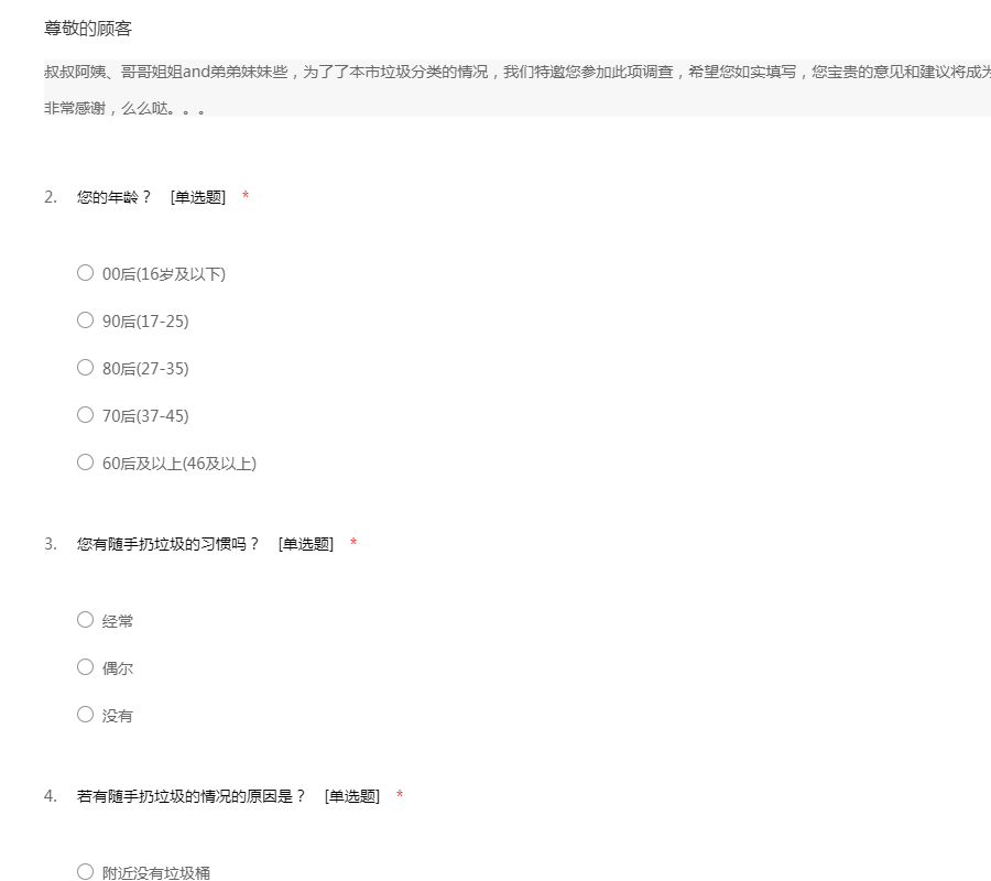 叔叔阿姨、哥哥姐姐and弟弟妹妹些,为了了本市垃圾分类的情况,我们特邀您参加此项调查,希望您如实填写,您宝贵的意见和建议将成为我们此次社会实践活动的重要参考材料。非常感谢,么么哒。。。