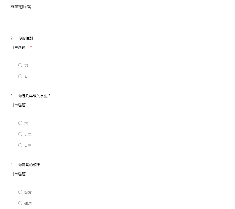 您好!如今社会网上购物已经越来越流行、家人朋友之间相互寄送物品也很频繁,快递成为我们日常生活不可或缺的一部分。因此我们将对校园快递使用现状做一个调查,希望您帮助我们填写此份问卷。谢谢!