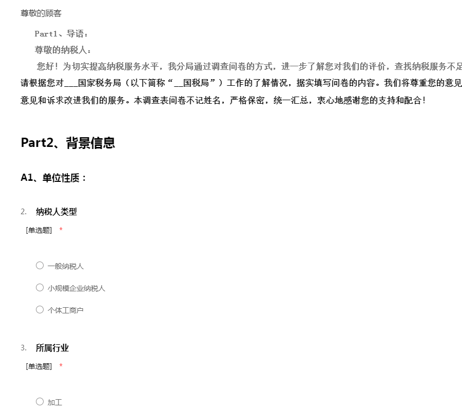Part1、导语: 尊敬的纳税人: 您好!为切实提高纳税服务水平,我分局通过调查问卷的方式,进一步了解您对我们的评价,查找纳税服务不足之处,以便持续改进。 请根据您对___国家税务局(以下简称“__国税局”)工作的了解情况,据实填写问卷的内容。我们将尊重您的意见,认真倾听您的呼声,并根据您的意见和诉求改进我们的服务。本调查表问卷不记姓名,严格保密,统一汇总,衷心地感谢您的支持和配合!