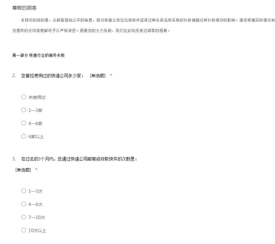 本研究的目的是:从顾客感知公平的角度,探讨快递公司在出现快件延误这种失误后所采取的补救措施对其补救绩效的影响。请您根据实际情况和想法填写,本调查所得数据仅供学术研究,您提供的任何信息都将予以严格保密。感谢您的大力协助,我们在此向您表达诚挚的感谢。