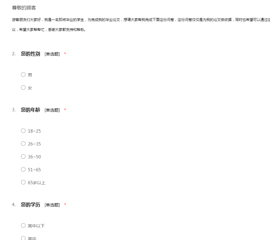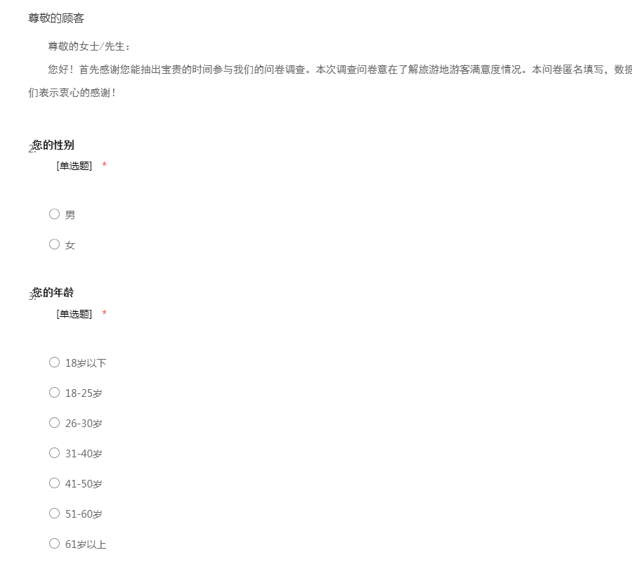 尊敬的女士/先生:您好!首先感谢您能抽出宝贵的时间参与我们的问卷调查。本次调查问卷意在了解旅游地游客满意度情况。本问卷匿名填写,数据仅供学术研究,对您的支持与合作,我们表示衷心的感谢!