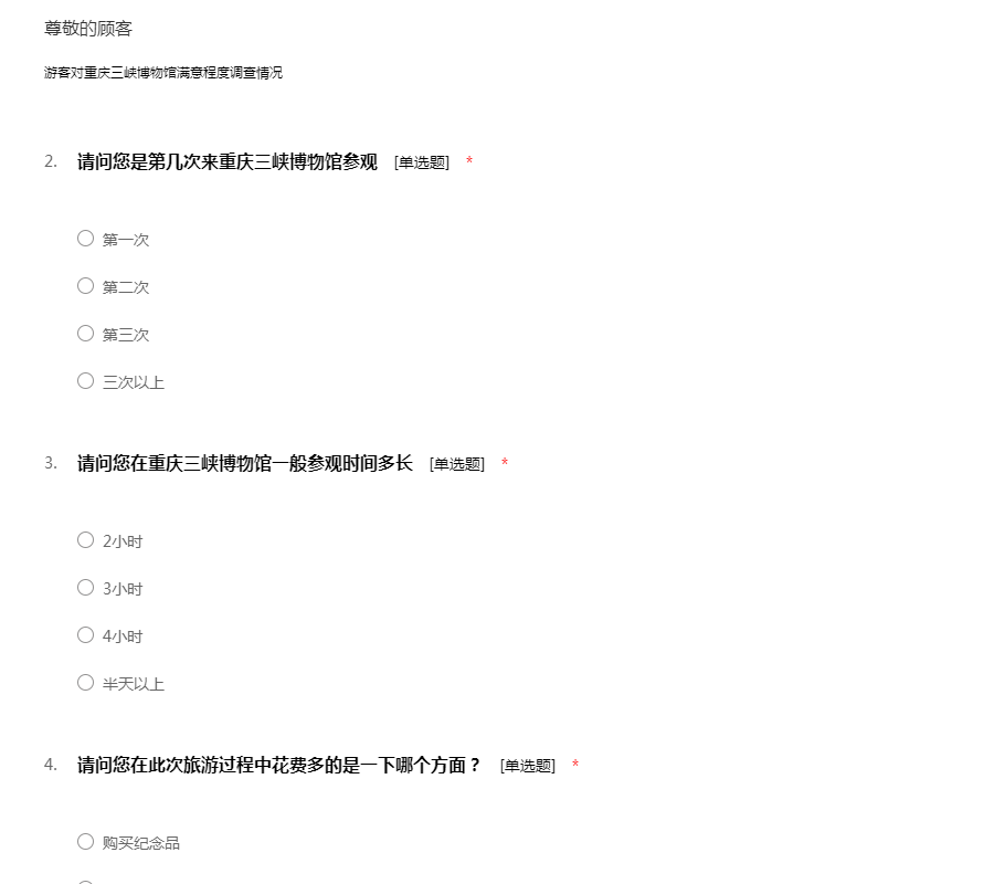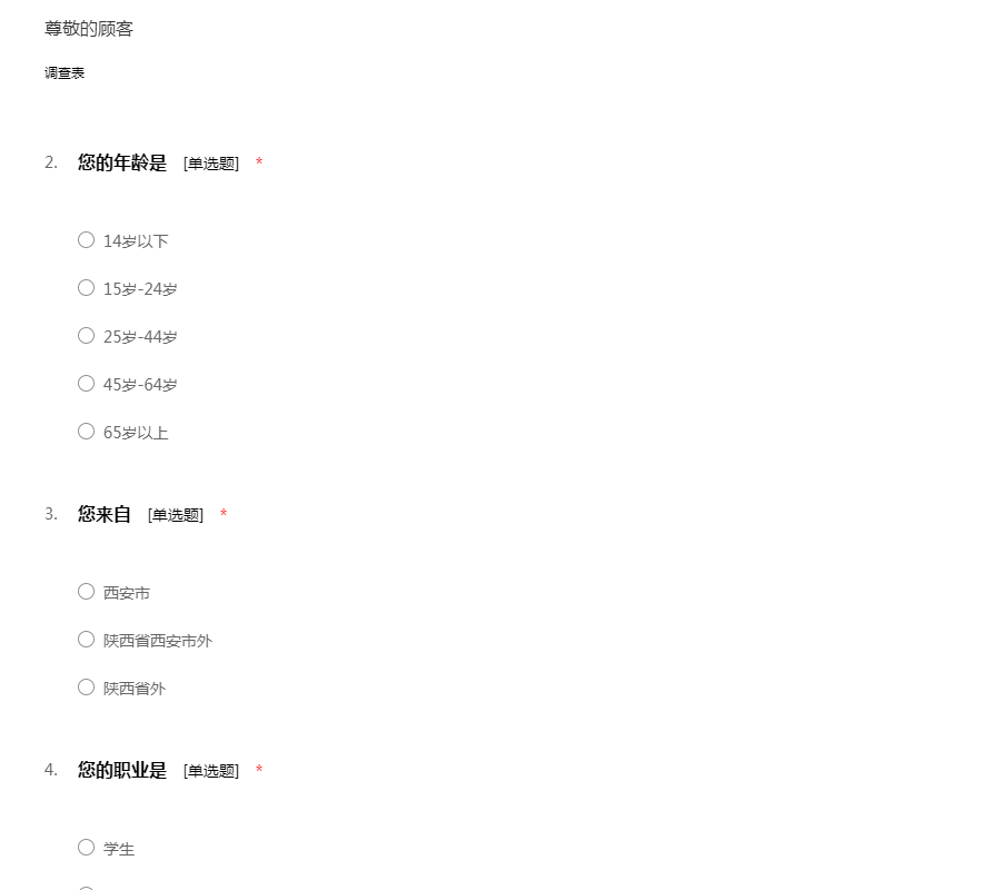 非常感谢您参与本次调查,本调查问卷将花3-5分钟完成。我们期望通过本次调查来了解各位游客对本地旅游的满意度及反馈意见,为建设好平遥古城旅游环境提供一定的参考。本次调查采取不记名方式进行,题型为选择题和简答题,请您认真阅读问卷中的每一道题目,并根据自身实际情况选择(请您在确定的相应项目前面的序号上打对号)。