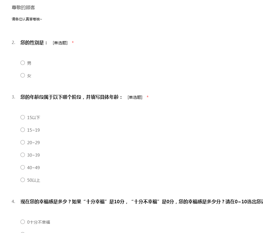亲爱的同学:你好!为了更好地了解大家的恋爱观及恋爱状况,为大家现在或以后可能遇到的问题提供帮助,我们特设计此问卷。问卷所用数据均用于统计分析且为匿名调查,我们会保护你的隐私权,望如实回答。非常感谢你的支持。