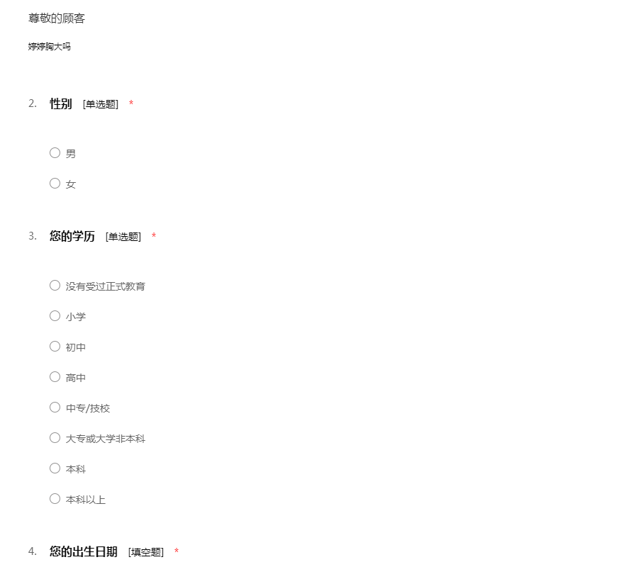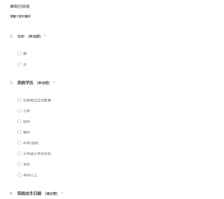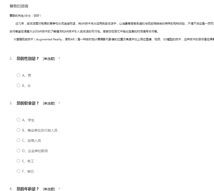 尊敬的先生/女士:您好! 近几年,实体店面对电商的竞争和分流连连败退,将AR技术充分运用到实体店中,让消费者感受到虚拟与现实相结合的特殊的购物体验,不得不说这是一项可以让实体店在低潮6年后,重新崛起的新兴技术。该问卷旨在调查大众对AR技术的了解情况和AR技术引入实体店的可行性。感谢您在百忙中抽出宝贵的时间填写本问卷。 ※增强现实技术(Augmented Reality,简称AR)是一种实时地计算摄影机影像的位置及角度并加上相应图像、视频、3D模型的技术,这种技术的目标是在屏幕上把虚拟世界套在现实世界并进行互动。