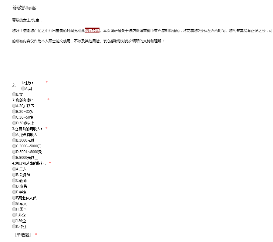 尊敬的女士/先生: 您好!感谢您百忙之中抽出宝贵的时间完成此调查问卷。本次调研是关于饭店微博营销中客户感知价值的,将花费您2分钟左右的时间。您的答案没有正误之分,可以完全根据您的体会来填写。 本人保证,您填答的所有内容仅作为本人硕士论文使用,不涉及其他用途。衷心感谢您对此次调研的支持和理解!