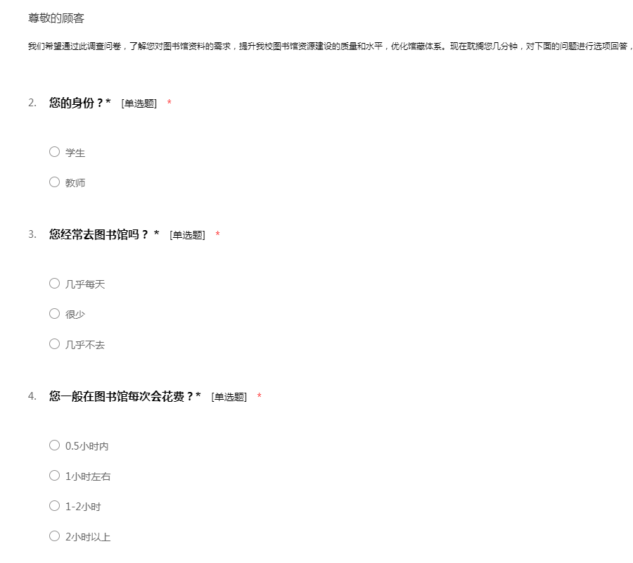 我们希望通过此调查问卷,了解您对图书馆资料的需求,提升我校图书馆资源建设的质量和水平,优化馆藏体系。现在耽搁您几分钟,对下面的问题进行选项回答,谢谢您对我们工作的支持与配合!