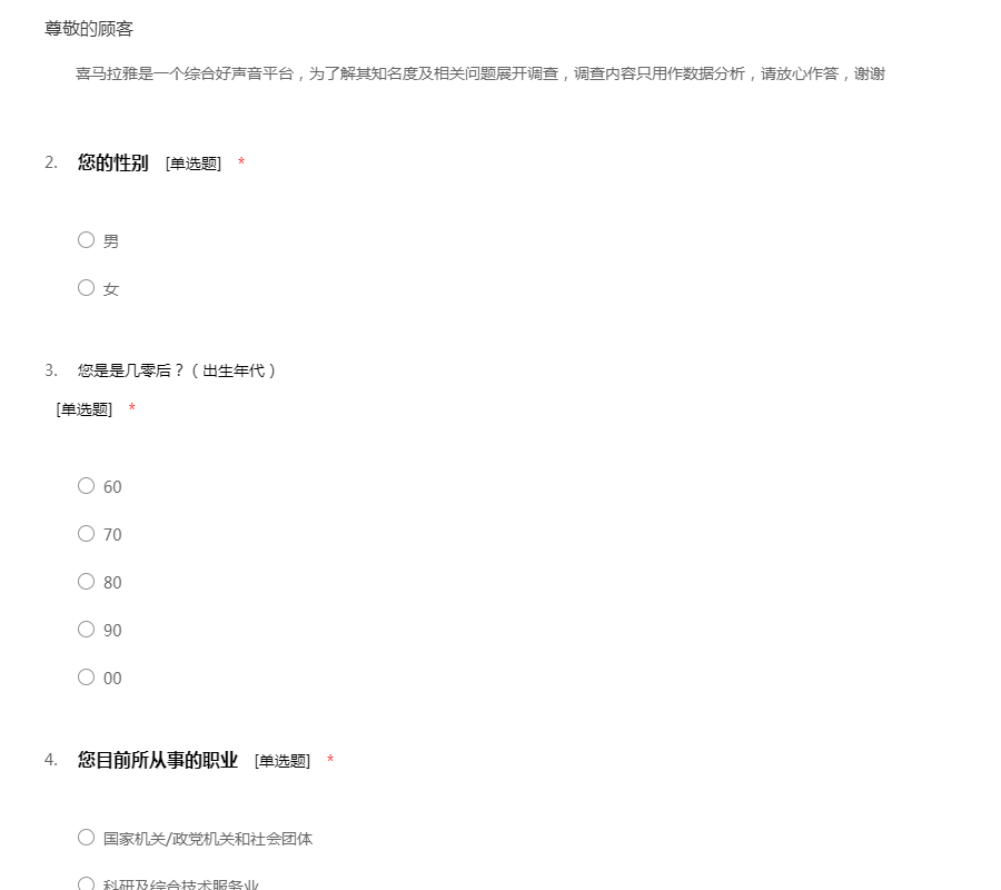 喜马拉雅是一个综合好声音平台,为了解其知名度及相关问题展开调查,调查内容只用作数据分析,请放心作答,谢谢