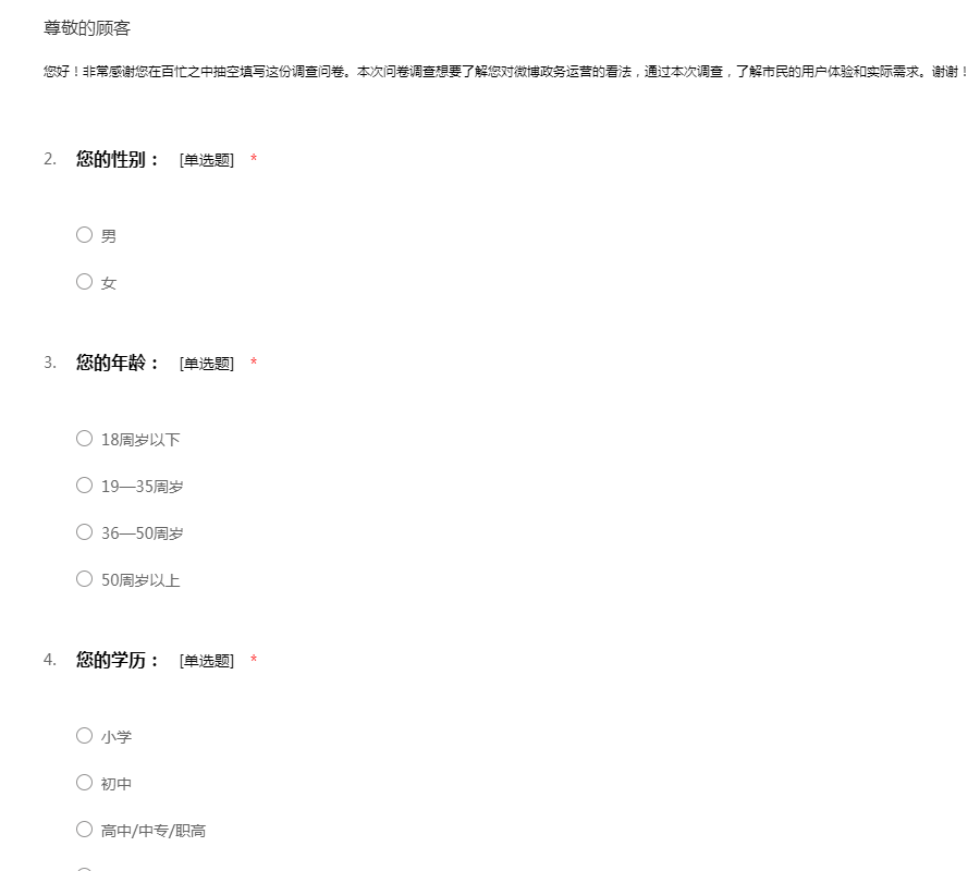 您好!非常感谢您在百忙之中抽空填写这份调查问卷。本次问卷调查想要了解您对微博政务运营的看法,通过本次调查,了解市民的用户体验和实际需求。谢谢!