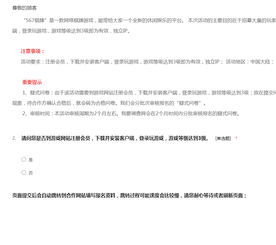 1、疑式问卷:由于该活动需要到合作网站通过邮箱注册激活和手机验证,免费参与每日一猜;并在第二天登陆网站免费参与每日一猜,视为有效用户;故在提交问卷后提示为“疑似问卷”,为正常现象,待合作方确认合格后,就会转为合格问卷。我们会分批次审核报名的“疑式问卷”。