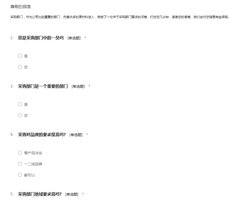 采购部门,作为公司比较重要的部门,负责许多的原材料进入,我做了一份关于采购部门需求的问卷,打扰您几分钟,感谢您的答卷,我们会对您信息完全保密。