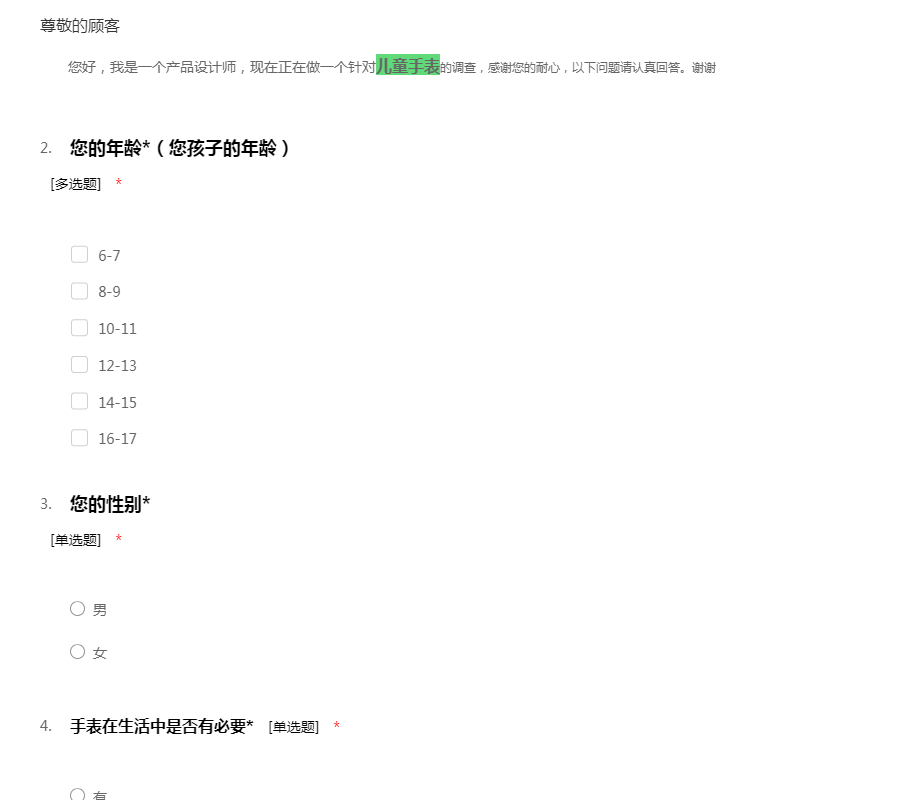 您好,我是一个产品设计师,现在正在做一个针对儿童手表的调查,感谢您的耐心,以下问题请认真回答。谢谢